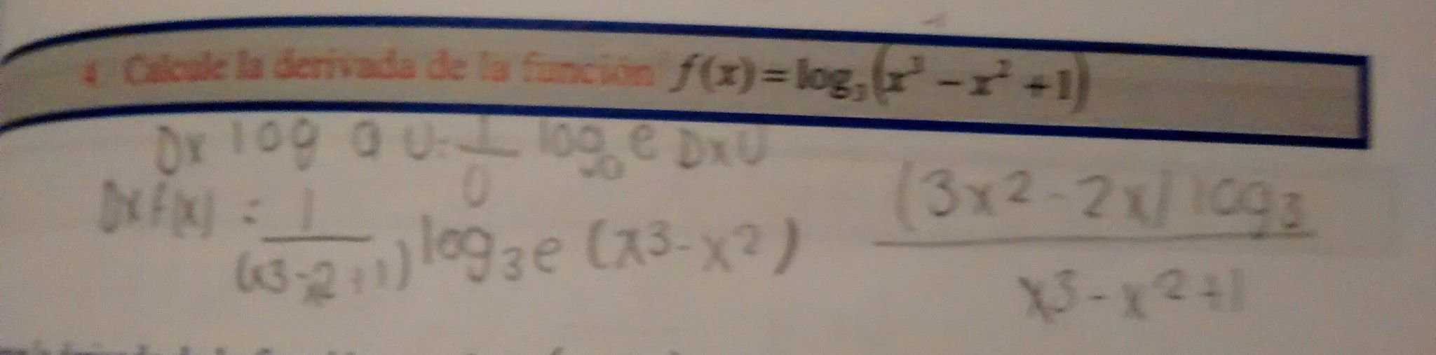 Se aplica el teorema correspondiente, en este caso es Dx log a u= 1÷u log a e Dx u. Se localiza u y a. Se sustituyen valores. Se calcula la derivada correspondiente. Se re ordenan los términos y el resultado de la derivada pasa como numerador. Se obtiene el resultado.