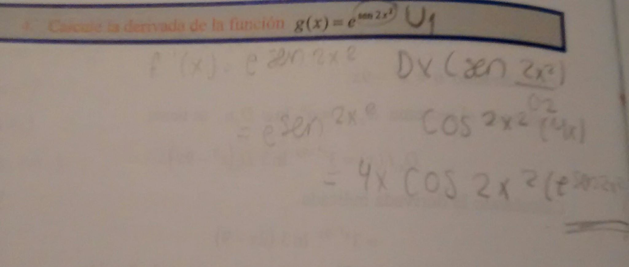 Se aplica el teorema correspondiente en este caso es Dx e^u= e^u Dxu. Se localiza u. Sustituimos los datos. Se calcula la derivada indicada. Se calcula nuevamente la derivada (la constante). Se reordenan los términos. Se obtiene el resultado.