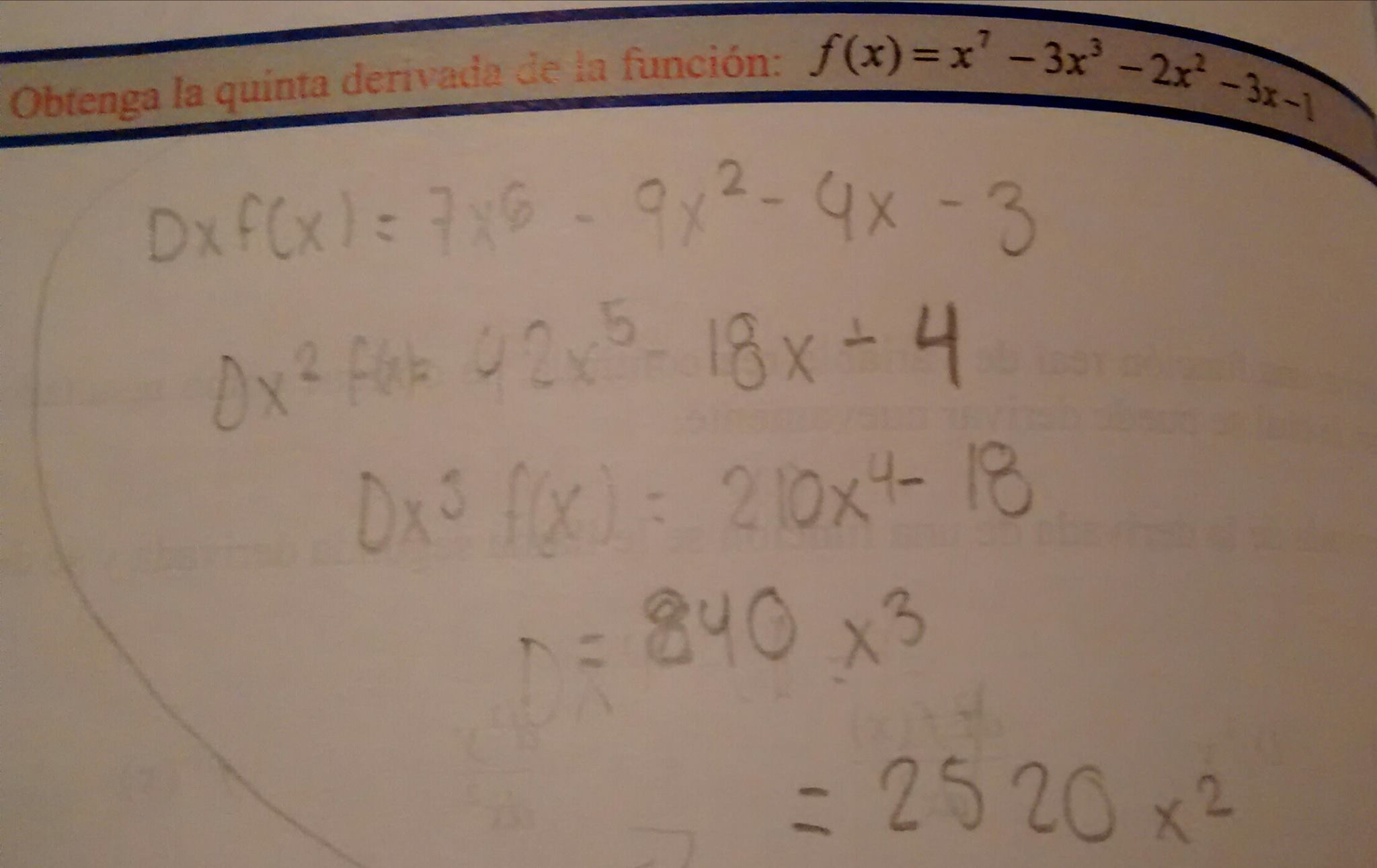 A la derivada de la derivada de una función se le llama segunda derivada análogamente la derivada de la segunda derivada se le llama tercera derivada. las derivadas obtenidas a partir de la segunda, se llaman derivadas de orden superior o derivadas sucesivas, siendo la primera derivada la ordinaria. Se realiza la primera derivada. Se realiza la segunda derivada. Así sucesivamente hasta que ya no tenga derivada el término.