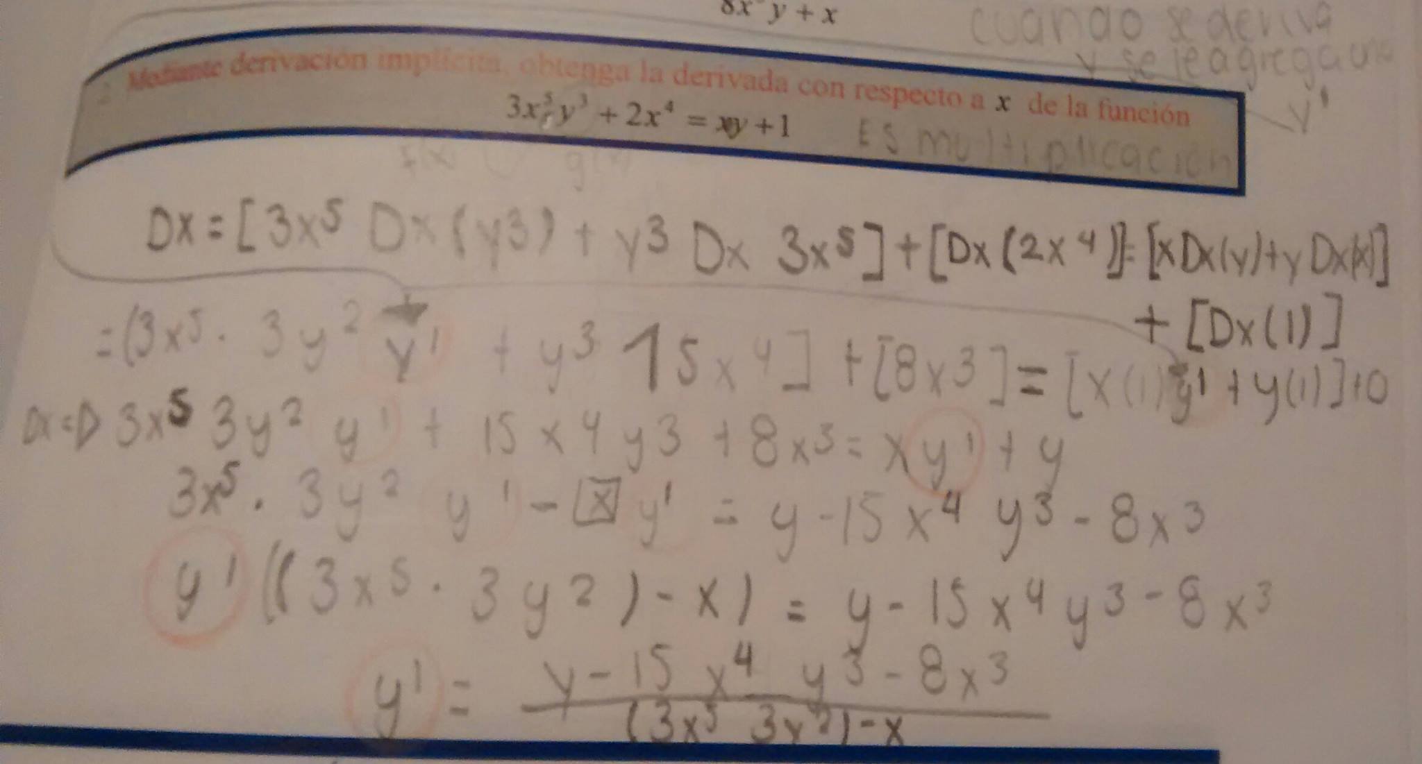 Se derivan todos los términos de la función con respecto a x. Se efectúan las operaciones indicadas. Utilizando las propiedades de la igualdad, se transforma la ecuación en otra equivalente de tal manera que en el primer miembro se tengan los términos que contengan a y'. Se factoriza y'. Se despeja y', que es la derivada que se desea obtener.