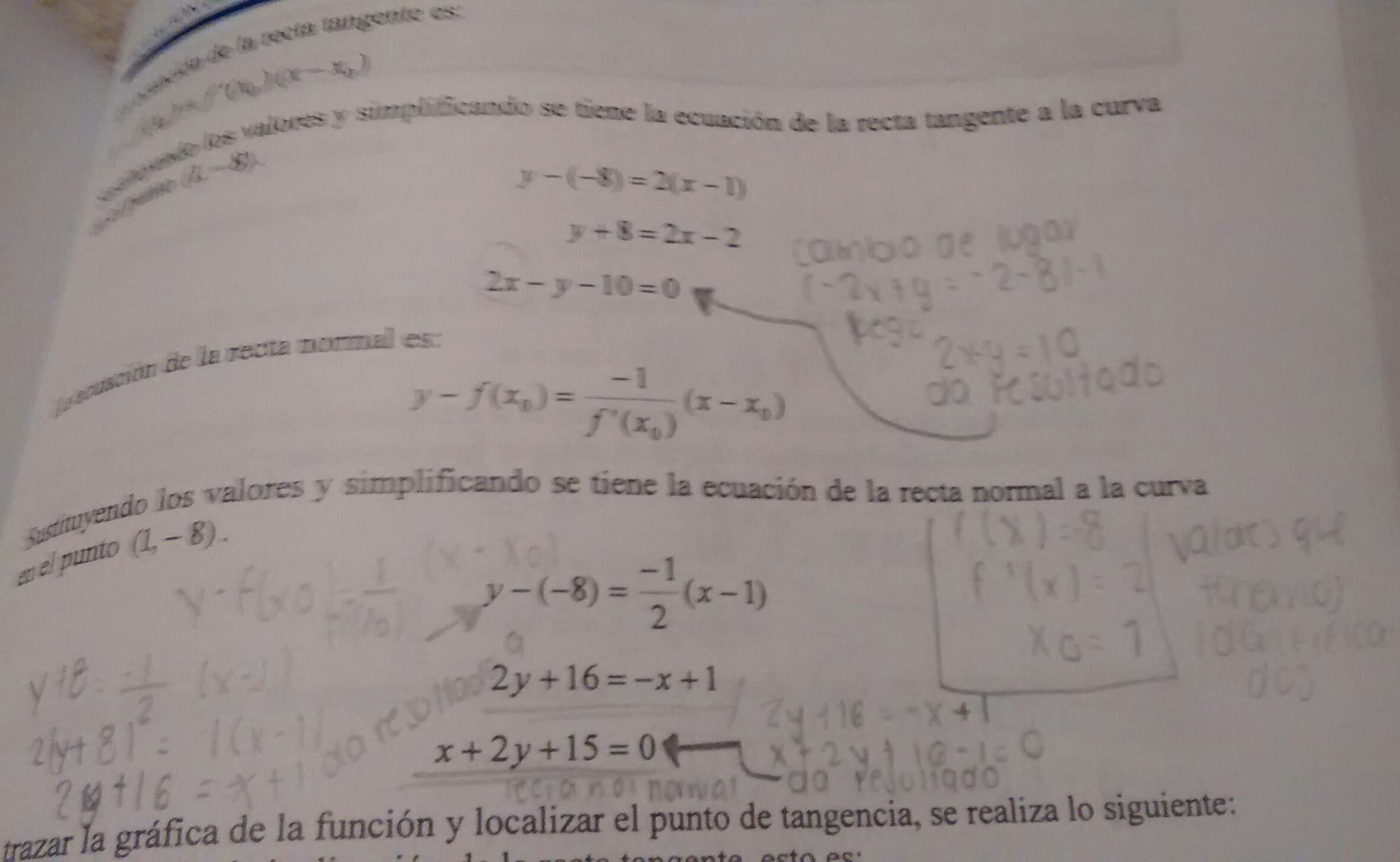 Se sustituye x=1 en la ecuación. Se deriva la función. Se aplica la ecuación de la recta tangente. Se sustituye los valores. Se obtiene el resultado. Se aplica la ecuación de la recta normal. Se sustituye los valores y se simplifica. Se obtiene el resultado.