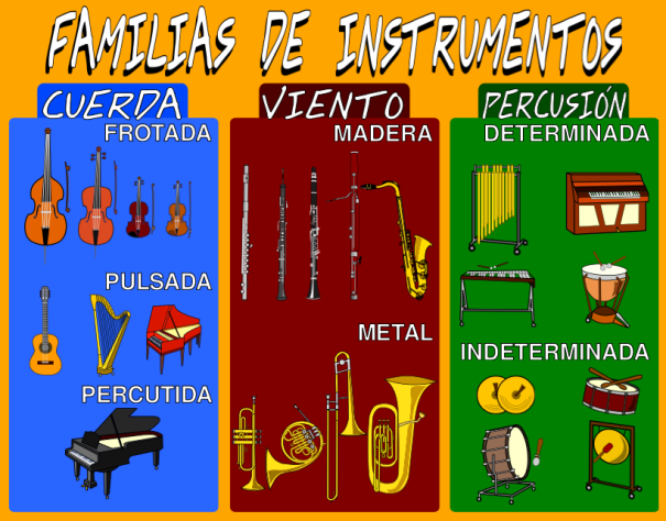 La clasificación más usada de manera convencional es la de viento, cuerda y percusión.Viento: saxofón, flauta, clarinete, trompeta, oboe, etc.Cuerda: guitarra, arpa, violín, piano (el piano es de cuerda percutida), etc.Percusión: timbal, tambor, platillos, bombo etc.Instrumentos eléctricos: bajo eléctrico, guitarra eléctrica, teremin, sintetizador, etc.
