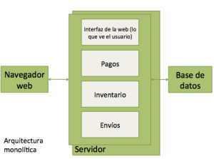 Cuando un usuario compre un producto vía web, mostremos los productos disponibles, etc., la aplicación responderá de una forma u otra, según la hayamos programado, pero el código de las distintas lógicas de negocio (inventario, pagos, envíos) aunque puede estar separado en distintos módulos del código, finalmente se empaqueta en un único archivo ejecutable. Por eso la llamo arquitectura monolítica.