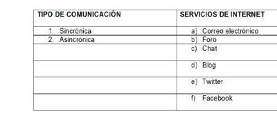 11. Elige la opción que relacione correctamente los elementos de la columna TIPO DE COMUNICACIÓN, con los elementos de la columna SERVICIOS DE INTERNET