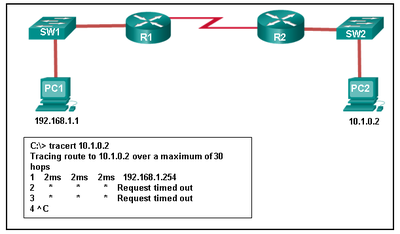 ¿Consulte la presentación. Un administrador está tratando de solucionar problemas de conectividad entre PC1 y PC2 y utiliza el comando tracert desde PC1 a hacerlo. Con base en el resultado que se muestra, donde el administrador debe empezar a solucionar problemas?