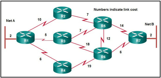 Consulte la presentación. OSPF se utiliza en la red. ¿Qué camino se elegirá por OSPF para enviar paquetes de datos desde la A a la Net Net B?