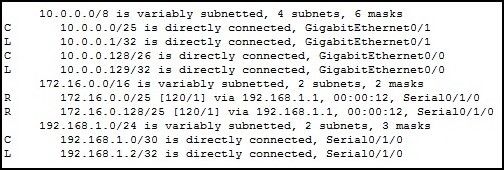 Consulte la presentación. Sobre la base de la salida parcial del comando show ip route, ¿qué dos hechos se puede determinar sobre el protocolo de enrutamiento RIP? (Elija dos.)