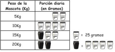 En un empaque de alimento para perros se muestra la siguiente tabla, con la información sobre las porciones diarias que debe consumir una mascota, según su peso: