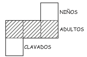 La siguiente figura representa la superficie de una piscina de 405 m de área. Esta piscina está distribuida en 5 zonas cuadradas de igual tamaño: una zona para los niños, 3 zonas para los adultos y una zona para practicar clavados. Las zonas están demarcas con cuerdas plásticas. El tamaño de la zona destinada para los niños equivale a