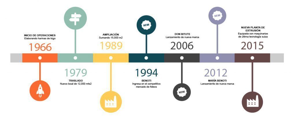 Al inicio elaboró solamente harina de [blank_start]1966[blank_end] panificación, gozando de la aceptación de las principales panaderías de la Gran Lima y la colonia italiana. [blank_start]1989[blank_end] En el transcurso del tiempo extiende su portafolio, buscando una diferenciación y satisfacer las necesidades de sus clientes, produciendo otro tipo de harinas como pastelera, panetonera, galletera, integral, entre las más conocidas.