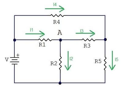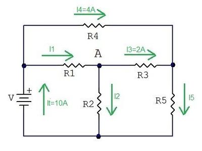 Teniendo en cuenta la figura, que ecuación representa la Ley de Corrientes de Kirchhoff en el nodo A