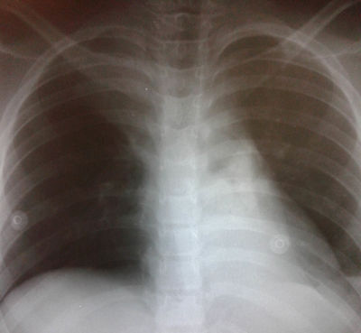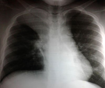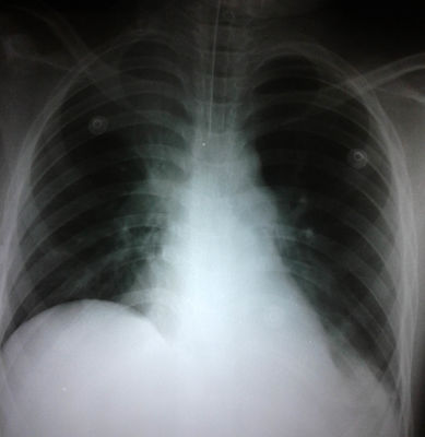 Placa de torax con atrapamiento apereo y atelectasia del vértice del pulmón derecho.