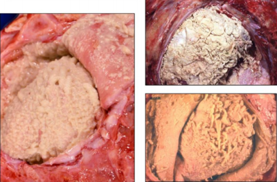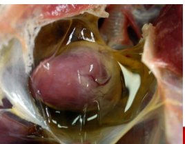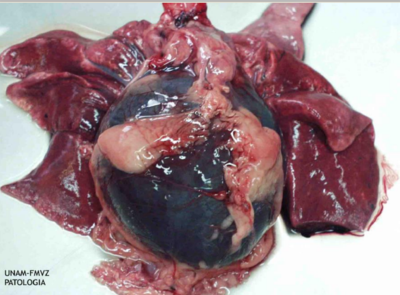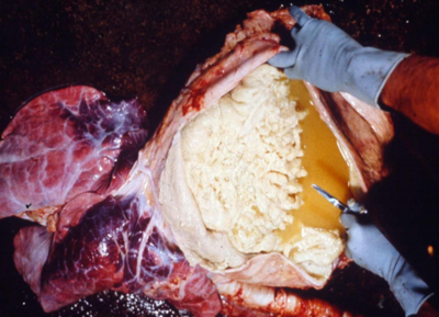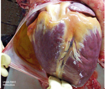 Pericardio muy engrosado, aspecto rugoso, presencia de exudado purulento, tejido conectivo fibroso en casos crónicos por penetración de objetos punzantes