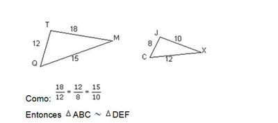 Si se sabe que los triángulos ABC y A´B´C´son semejantes y que el los lados del triángulo ABC son 5, 8 y 12 respectivamente, ¿Cuáles son las mediadas de dos de los lados del triángulo A´B´C´ si el lado homologo al primer lado del otro triángulo es 20?