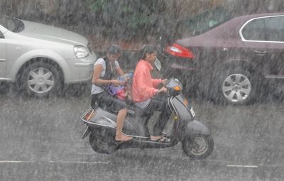 Cuando circula con su motocicleta en condiciones de lluvia intensa y niebla, ¿qué luces debe encender, al menos?