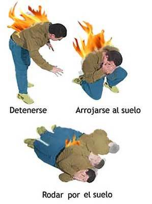 Agacharse al nivel del piso y buscar una salida, si la ropa se prende rodar por el suelo para apagarla