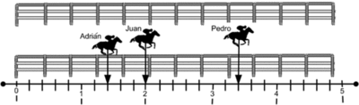 En una carrera de caballos se da una competencia entre tres amigos Adrian, Juan y Pedro, en la siguiente imagen se presentan las distancias que llevan recorrido a que fracción corresponde cada uno?