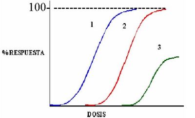 La siguiente curva muestra la curva dosis respuesta de tres fármacos agonistas del mismo sistema de receptores, de su análisis podemos deducir que: