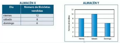 Dos almacenes se dedican a la venta de bicicletas. En la tabla se muestra la cantidad de bicicletas que vendió el almacén X durante los días viernes, sábado y domingo. En la gráfica de barras se muestra la cantidad de bicicletas que vendió el almacén Y durante los mismos días. Sobre la venta de bicicletas en los almacenes mencionados, ¿cuál de las siguientes afirmaciones es verdadera?