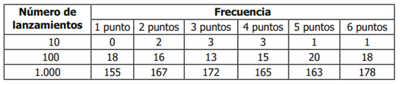 Observa los resultados obtenidos luego de lanzar un dado corriente 10, 100 y 1.000 veces. De acuerdo con los resultados de la tabla, si el dado se lanza 10.000 veces, es de esperar que se obtengan 3 puntos, cada: