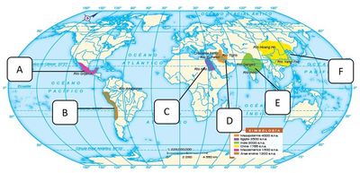 Mesopotamia=A; India=B; Área Andina=C; Egipto=D; China=E; Mesoamérica=F