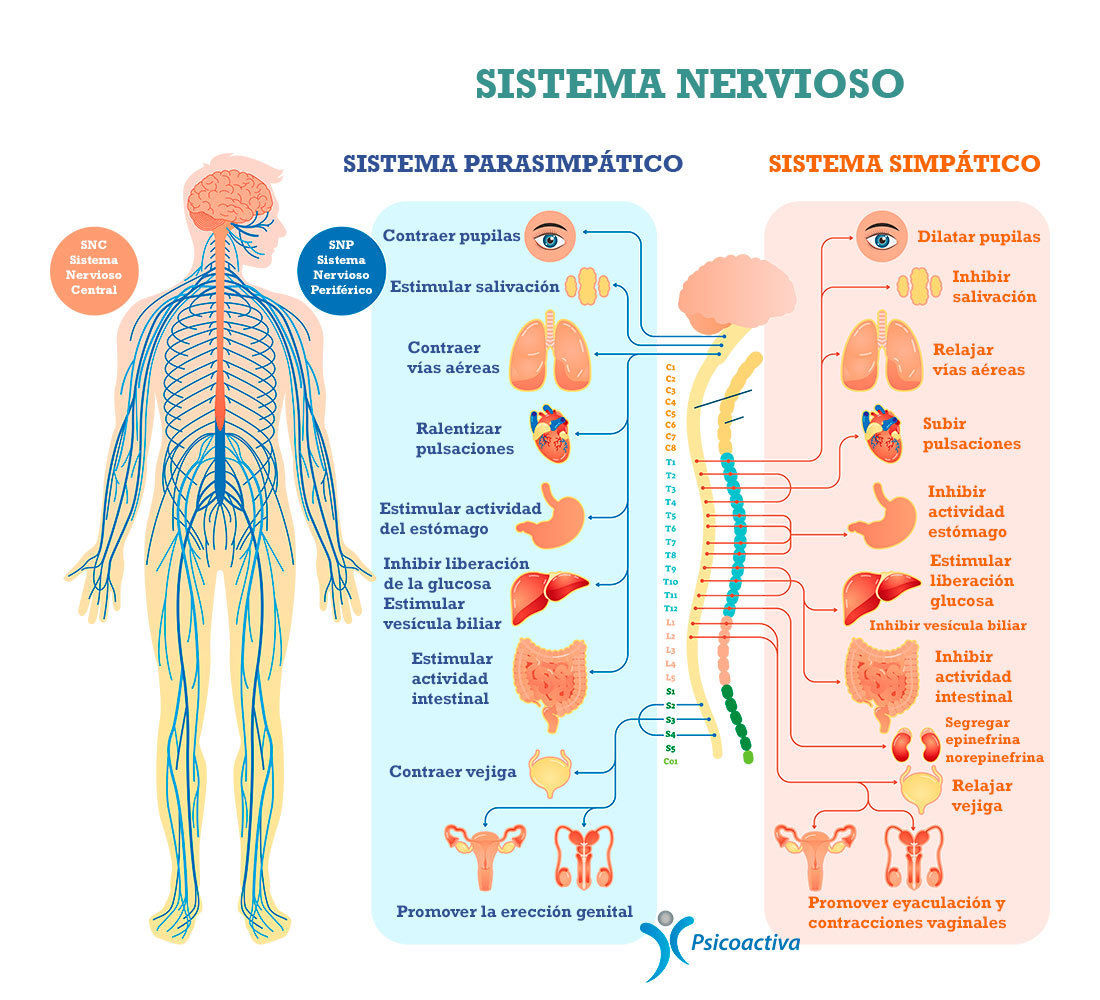 El sistema [blank_start]simpático[blank_end] es el encargado de regular las respuestas de lucha o huida. Moviliza al [blank_start]cuerpo[blank_end] para responder en una situación de peligro y prepara al cuerpo para gastar energía y hacer frente a posibles amenazas en el medio ambiente. Cuando se necesita entrar en acción, el sistema simpático desencadena una respuesta aumentando la frecuencia [blank_start]cardíaca[blank_end] y respiratoria, incrementando el flujo [blank_start]sanguíneo[blank_end] de los músculos, activando la secreción de sudor y dilatando las pupilas.