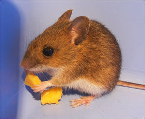 A mouse [blank_start]nibbles[blank_end] on cheese.