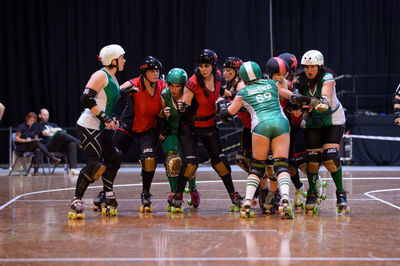 Un jam está activo, mientras se juega un referee (árbitro) advierte con un "No Pack". En ese momento, las bloqueadoras más atrasadas tienen que correr para reformar el pack.