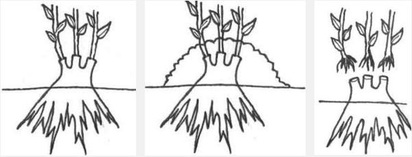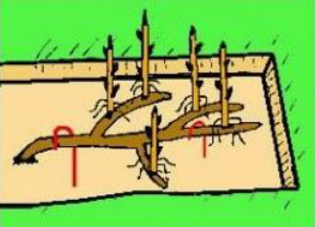 Para hacer este tipo de acodado se necesita [blank_start]cortar la planta hasta el suelo[blank_end], en la [blank_start]estación de reposo[blank_end], y amontonar en primavera tierra u otro medio de enraíce alrededor de la base de los brotes nuevos para estimular en ellos la formación de raíces. Cubriendo las ramas con tierra [blank_start]se blanquean[blank_end] y se promueve en ellas la formación de raíces.
