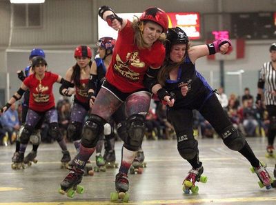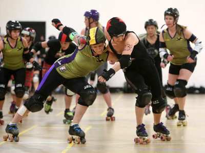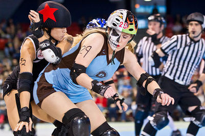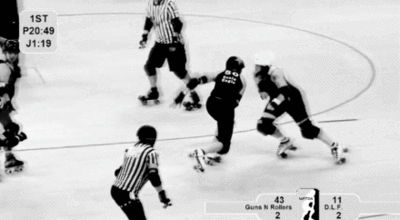 Una patinadora realiza un bloqueo contra los brazos de una rival, es un bloqueo legal.