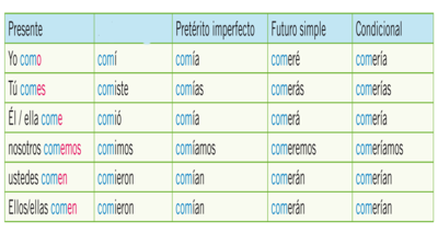 El título que falta en la segunda columna de la conjugación del verbo regular comer es [blank_start]PRETÉRITO SIMPLE[blank_end]