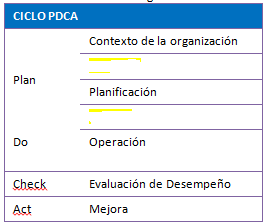 Complete la tabla del Ciclo PDCA en un Sistema Integrado de Gestión HSEQ [blank_start]___[blank_end] y [blank_start]___[blank_end]