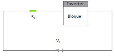 En el siguiente circuito tenemos una resistencia en serie con el bloque “Inverter” (el bloque representa un circuito eléctrico). El bloque debe funcionar a 2 v y soporta una potencia máxima de 40mW. Calcular el valor de R1 para conseguir que el bloque funcione correctamente si el voltaje total es de 9 v.