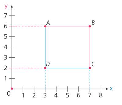 Diana tiene que localizar el cuarto vértice de un cuadrado. Si los tres vértices que conoce son: A (3, 6); B (7, 6) y C (3, 2).