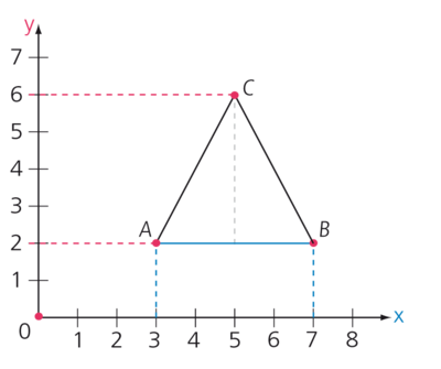 Marco quiere representar un triángulo isósceles en el plano cartesiano. Si sabe que dos de los vértices del triángulo son los puntos A (3, 2) y B (7, 2), las coordenadas que puede ubicar el tercer vértice es (7,6).