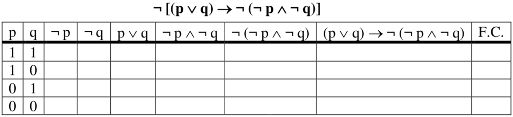 La siguiente fórmula és una contradicción: ¬ [(p v q) → ¬ (¬ p ^ ¬ q)]