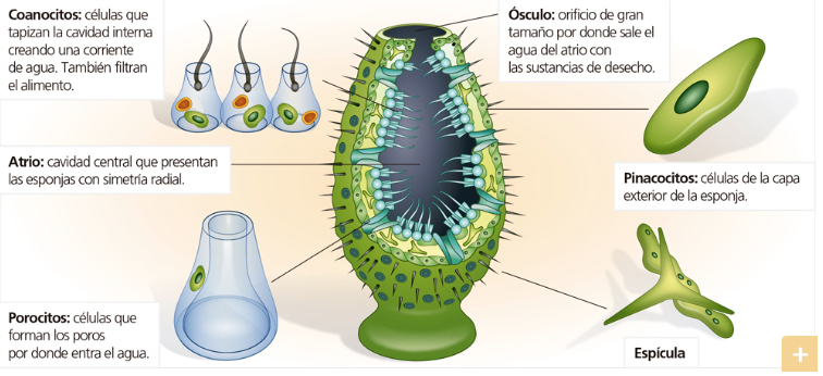Tiene forma de saco, presentan multitud de huecos o poros, Tienen un esqueleto interno que les da protección, Puede estar formado por espinas rígidas, llamadas especulas.