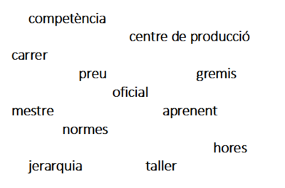 La ciutat medieval es va convertir en un [blank_start]centre de producció[blank_end] d'objectes manufacturats. Els artesans d'un mateix ofici acostumaven a viure al mateix [blank_start]carrer[blank_end], que rebia el nom de l'activitat que s'hi feia: argenters, oller, tintorers, flassaders... Els artesans de cada ciutat s'organitzaven en [blank_start]gremis[blank_end] per oficis, per protegir-se de la [blank_start]competència[blank_end] dels artesans d'altres llocs i per supervisar la producció. Dins del gremi hi havia una [blank_start]jerarquia[blank_end] molt rígida: primer s'havia de ser [blank_start]aprenent[blank_end], al cap d'uns anys es passava a ser [blank_start]oficial[blank_end] i, finalment, a [blank_start]mestre[blank_end] artesà, que ja podia tenir el seu propi [blank_start]taller[blank_end] i disponia d'eines pròpies. El tallers eren, a la vegada, l'habitatge del mestre artesà.