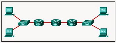 Rellena con un números: Un paquete desde el PC-1 tiene que atravesar [blank_start]3[blank_end] saltos para llegar al PC-4.