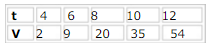 El maestro de biología presentó a sus alumnos la siguiente tabla de crecimiento de una bacteria, en donde t representa el tiempo de crecimiento y V la velocidad.