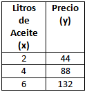 Maria compra aceite comestible al mayoreo. La siguiente tabla muestra el precio total que debe pagar.