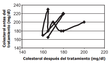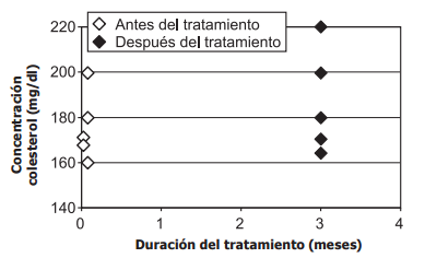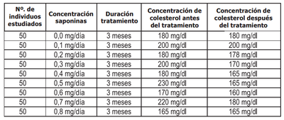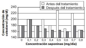 Las saponinas son unos detergentes naturales que se extraen de algunas plantas del desierto. Se sabe que estas saponinas forman complejos insolubles con el colesterol, lo cual puede tener implicaciones importantes en la nivelación de la concentración del colesterol en la sangre. Un grupo de científicos estudió su efectividad en la reducción del colesterol sanguíneo y para ello realizaron el siguiente experimento: A unos individuos entre 40-50 años cuyo colesterol era superior al rango permitido (160mg/dl) les proporcionaron pastillas con diferente concentración de saponina, a saber: (ver imagen)
