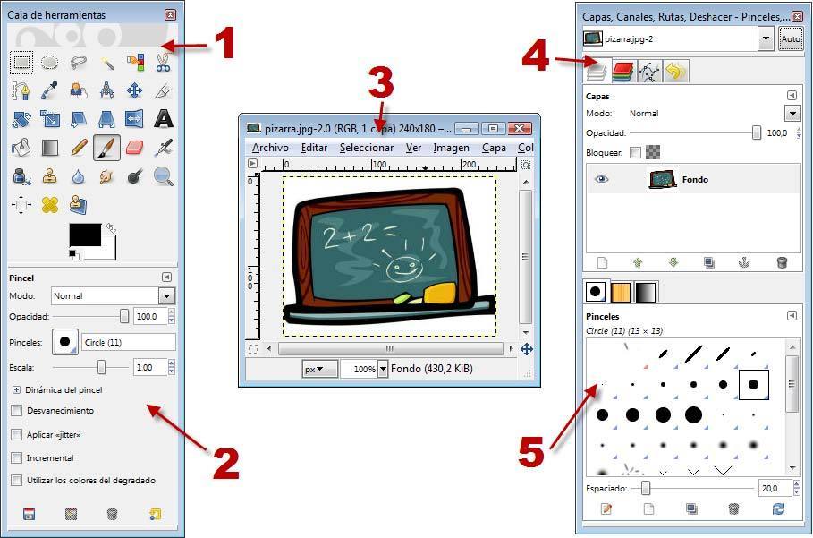 Herramienta pincel, aerógrafo, difuminar, clonado, texto