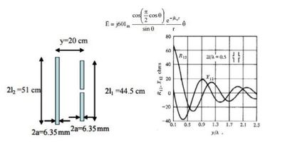 Considere la antena Yagi de la figura funcionando a una frecuencia de 300 MHz.. Haga la aproximación de que las dos antenas son iguales y de longitud 2l=λ/2 tanto para estimar la impedancia mutua como para el cálculo del campo radiado por ambos dipolos. La utilización de complejos en módulo y argumento es recomendable para facilitar los cálculos. La expresión del campo del dipolo λ/2 situado sobre el eje z es: