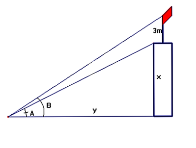 Desde un punto P del suelo vemos una bandera en lo más alto de una torre. Los ángulos A y B de la figura miden 30º y 45º respectivamente. Si el mástil de la bandera mide 3 m, calcular la altura del edificio.
