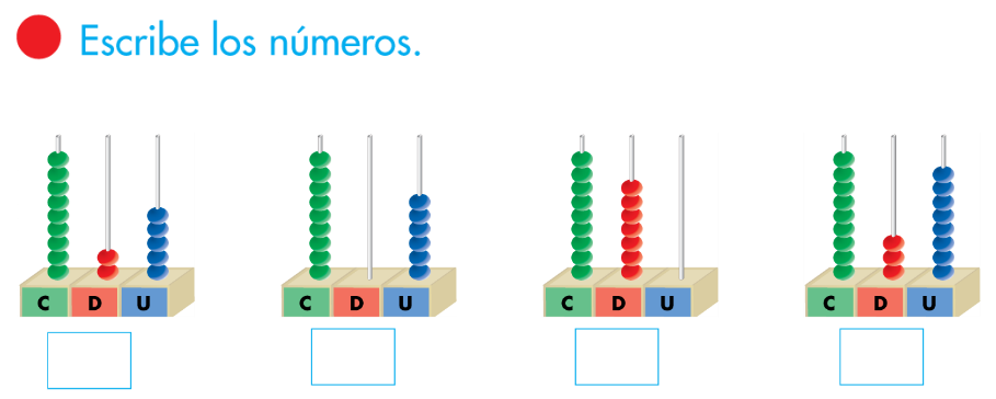 Escribe el número de tres cifras que corresponda a cada ábaco.