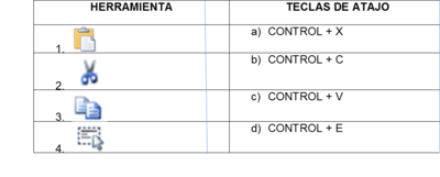 Relaciona la columna herramienta con la columna teclas de atajo. De las operaciones de copiar, mover, pegar y seleccionar diapositivas.