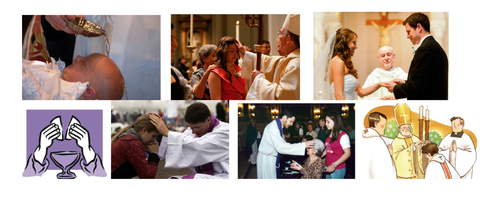 Los siete sacramentos son bautismo, confirmación, eucaristía, penitencia, orden sacerdotal, matrimonio y unción de los enfermos.