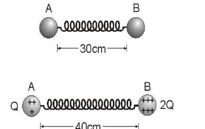 Dos esferas pequeñas están unidas por un resorte de longitud natural 30 cm. Las esferas se cargan