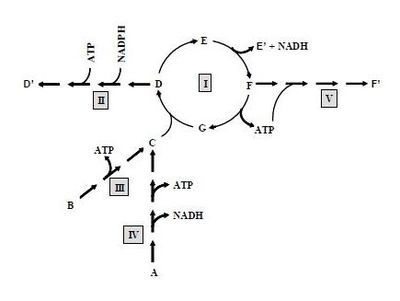 I=CO2 II=CO2 III=NADH IV=NADPH V=Acetil-CoA